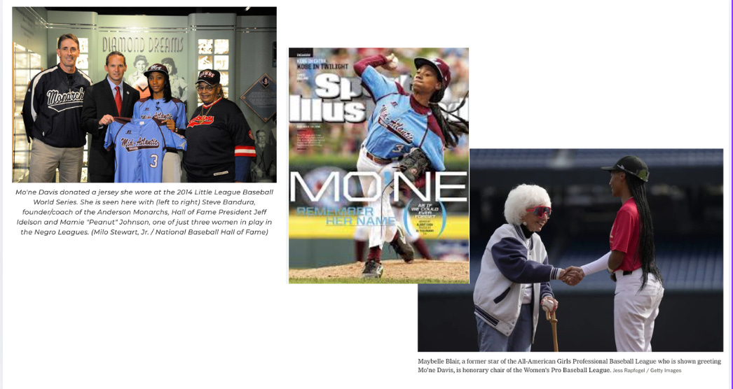 Among the women players is Mo’ne Davis, who threw a shut out in the 2014 Little League World Series at age thirteen. Her fast ball clocked at 70 m.p.h. The Philadelphia native was the eighteenth girl to play in the championships, the sixth to get a hit and the first Little Leaguer to appear on the cover of Sports Illustrated, bumping Kobe Bryant. Davis donated her Anderson Monarchs jersey to the Baseball Hall of Fame, accompanied by teammates and Mamie Johnson, who had played in the Negro Baseball League.